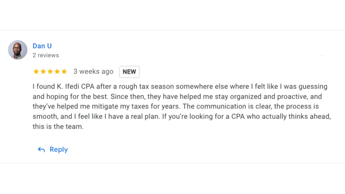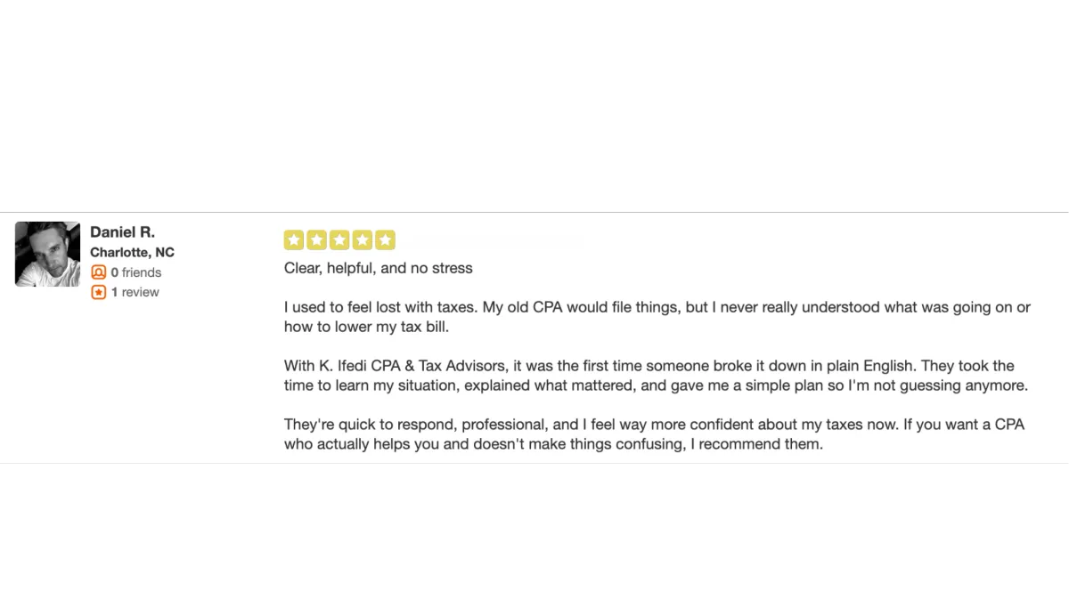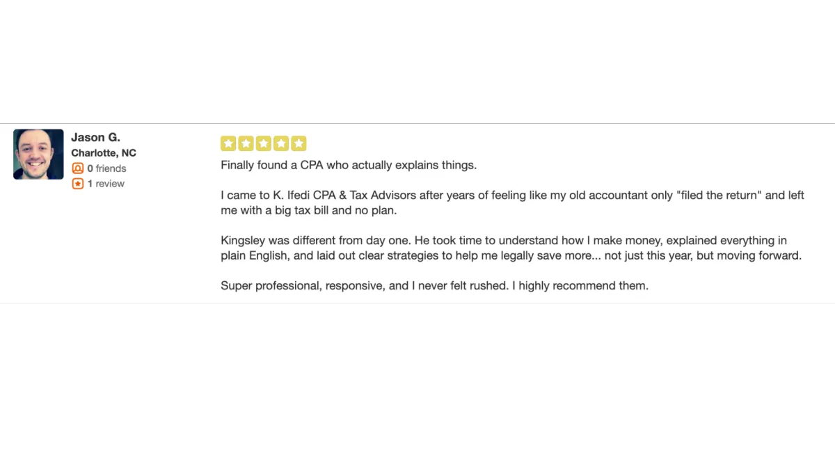 "I’ve worked with Kingsley for years, and he’s saved my practice thousands in taxes. He explains things clearly, so I know what’s happening and why. Our plan is organized, expectations are aligned, and tax time feels smooth. Now I can focus on my practice, not the IRS."
